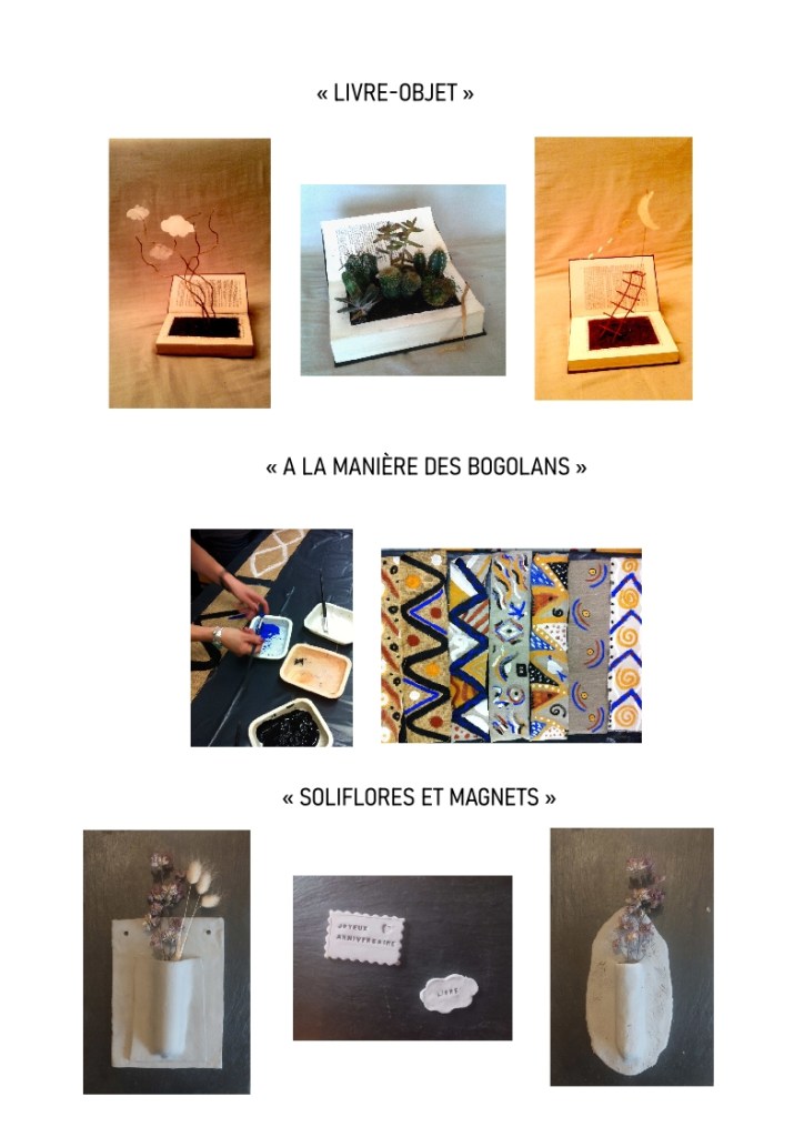 À travers des ateliers accessibles à tous je propose des initiations à la création en tout genre (peinture aux pigments, argile, aquarelle, fabrication d’objets « décoratifs », détournement d’objets, etc.).