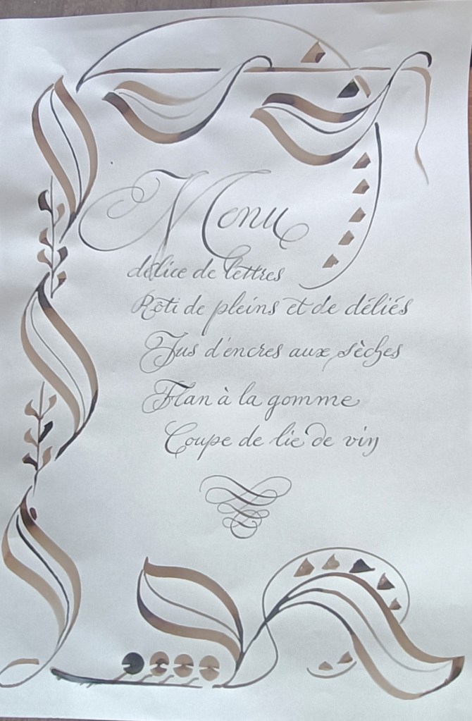 A partir des avis qui se sont dégagés de cette première séance , les 12 personnes présentes ont confirmées le souhait d’un apprentissage calligraphique, que ce soit sur la base du style Onciale pour faire des lettrines, d’un style Onciale pour faires des lettrines, ou gothique pour aller vers le médiéval ou encore anglaise utiliser en textes de faire-parts ou autres menus ou de dessins d’ornements de pages ou de figures utilisant les outils de la calligraphie etc…