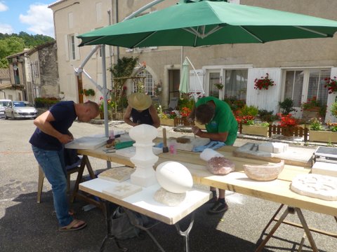 Photos: Les poteries de Coline – Les tailleurs de pierre de Reillac(46) – Sculptures de Maurice – La Bibliothèque Intercommunale de la Sauvetat de savères – Les bijoux de Cécile Maurel – Le cuir de Aurélie Pinsolle – La porcelaine froide de Adèle Mette – La vannerie de Timothé Cousin – Création d’un vélo en fer forgé par Solenne Huet